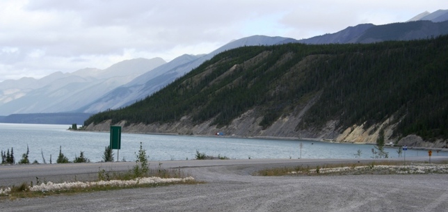 Let op het blauwe stipje: een grote oplegger-combinatie doorkruist de Alaska Highway langs het meer