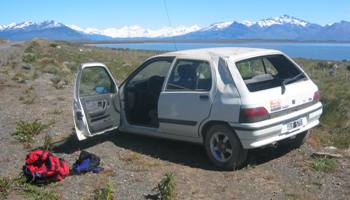 De karavaan met tourbussen komt me tegemoet, wanneer ik al terug ga langs de bochtige gravelwegen. Ik ben blij als ik de asfaltweg heb bereikt en geniet van het Lago Argentino links van me. Als een beginner stuur ik ondertussen naar rechts. Twee wielen naast het asfalt, knullige stuurcorrecties en een koprol aan de andere kant van de weg. Geen schrammetje, geen pijn, coolywooly uitgestapt: de auto stond immers weer op zijn wielen. Fotootjes gemaakt en naar El Calafate gelift. Draaien deed één van de wielen namelijk niet meer.